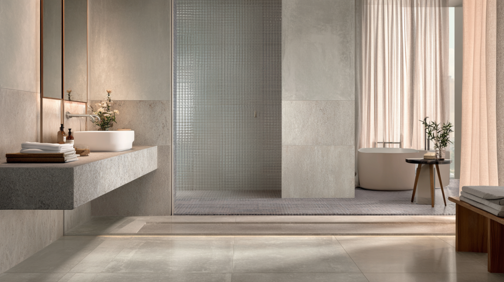 | Пол вне душа | Керамогранит, мат/структура | R10 (DIN 51130) | ≥ 0.42 (ANSI A326.3) | BIa ≤ 0.5% (EN 14411) |